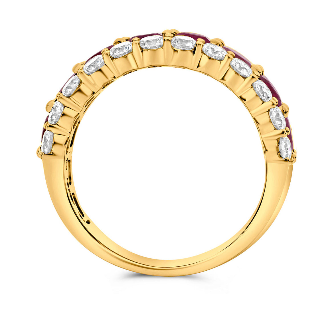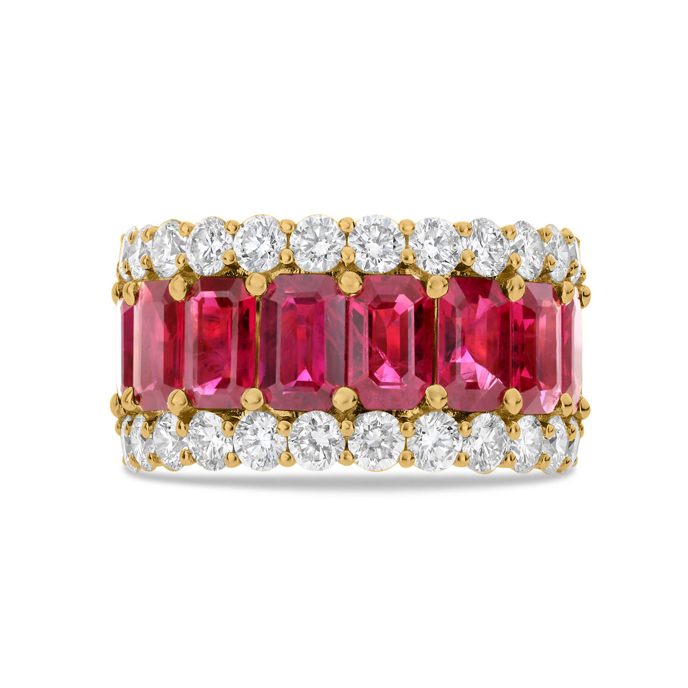 Crafted in luminous 14K yellow gold, this striking wide band ring features a vivid row of 4.53 carats total weight of emerald-cut rubies. The richly saturated red gemstones are flanked by two sparkling rows of round brilliant diamonds totaling 1.78 carats, adding radiant contrast and depth. Elegant and bold, this ring makes a powerful statement from every angle.
