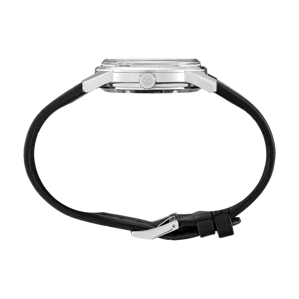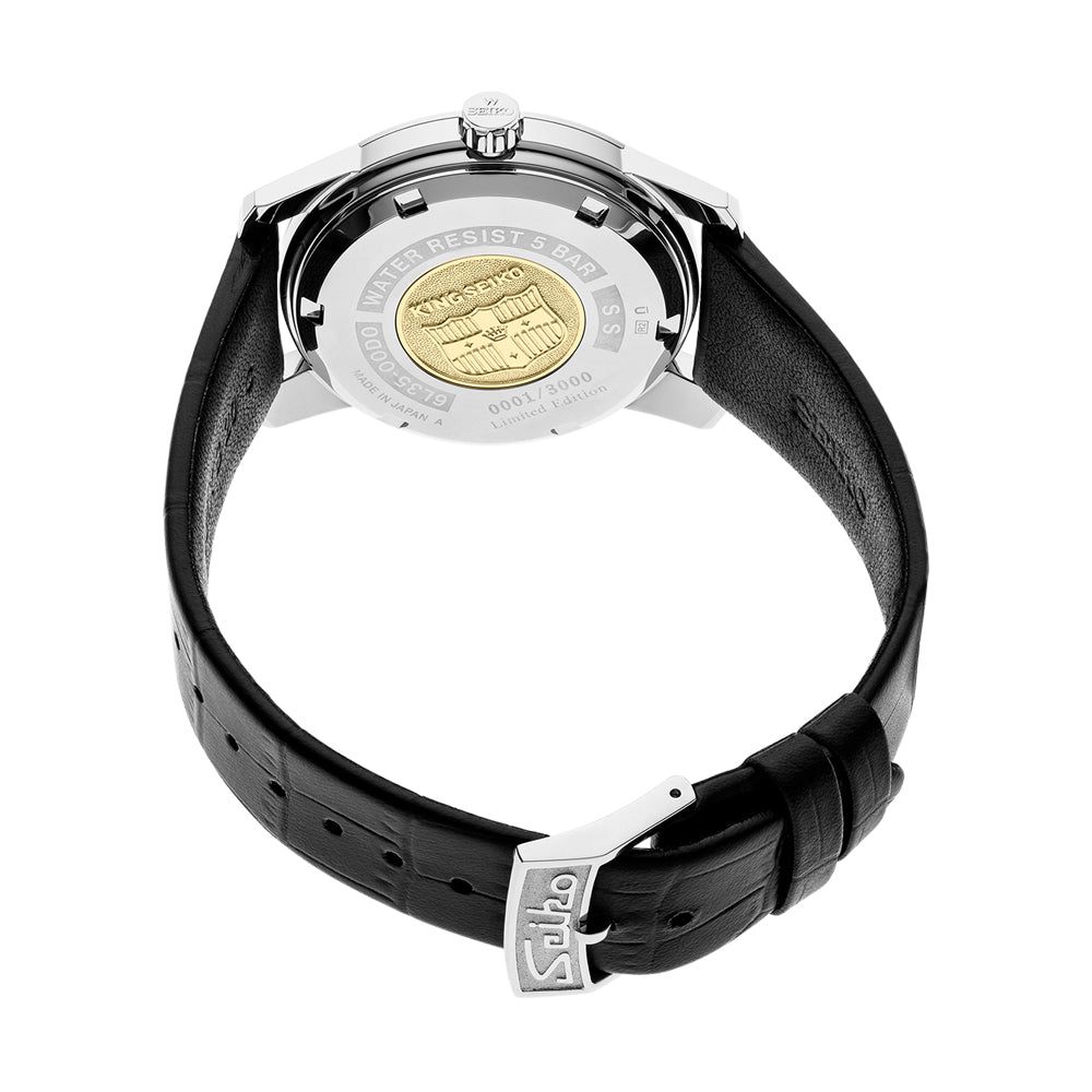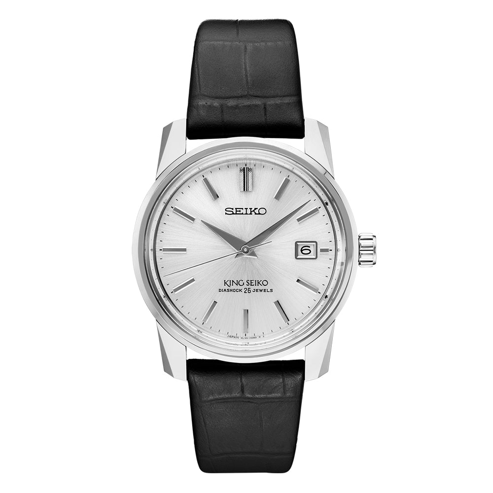 This Seiko King Seiko SJE083 has an automatic movement contained within a 38.1mm stainless steel case. The silver dial has a date display and is protected by sapphire crystal. The black leather strap has a steel pin buckle. Water resistant to 50 meters. Limited edition of 3,000 pieces.