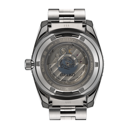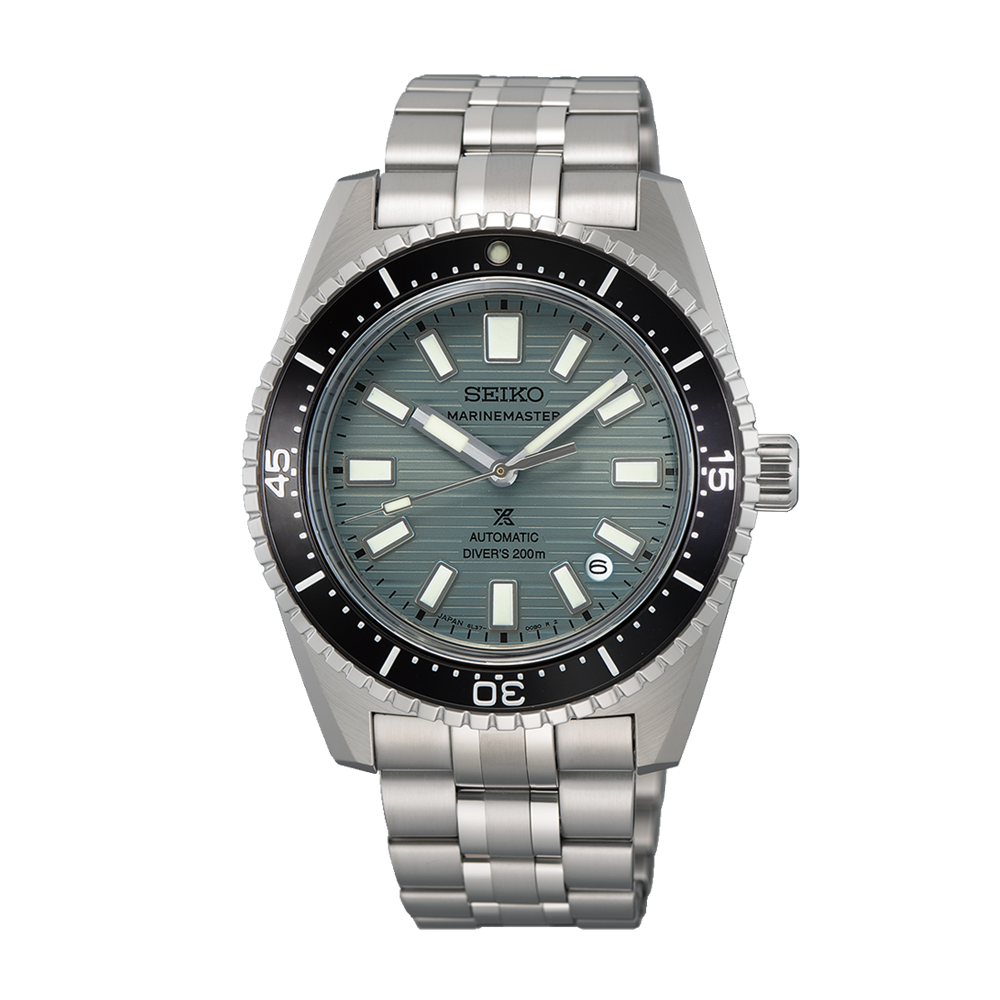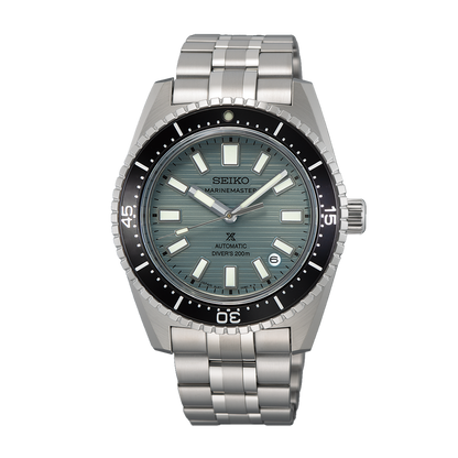 The Seiko Prospex Marinemaster watch has an automatic movement housed within a 39.50mm stainless steel case with a black unidirectional rotating bezel. The gray-green dial features a date window and is protected by sapphire crystal. The stainless steel bracelet leads to a deployant clasp. Water resistant to 200 meters.