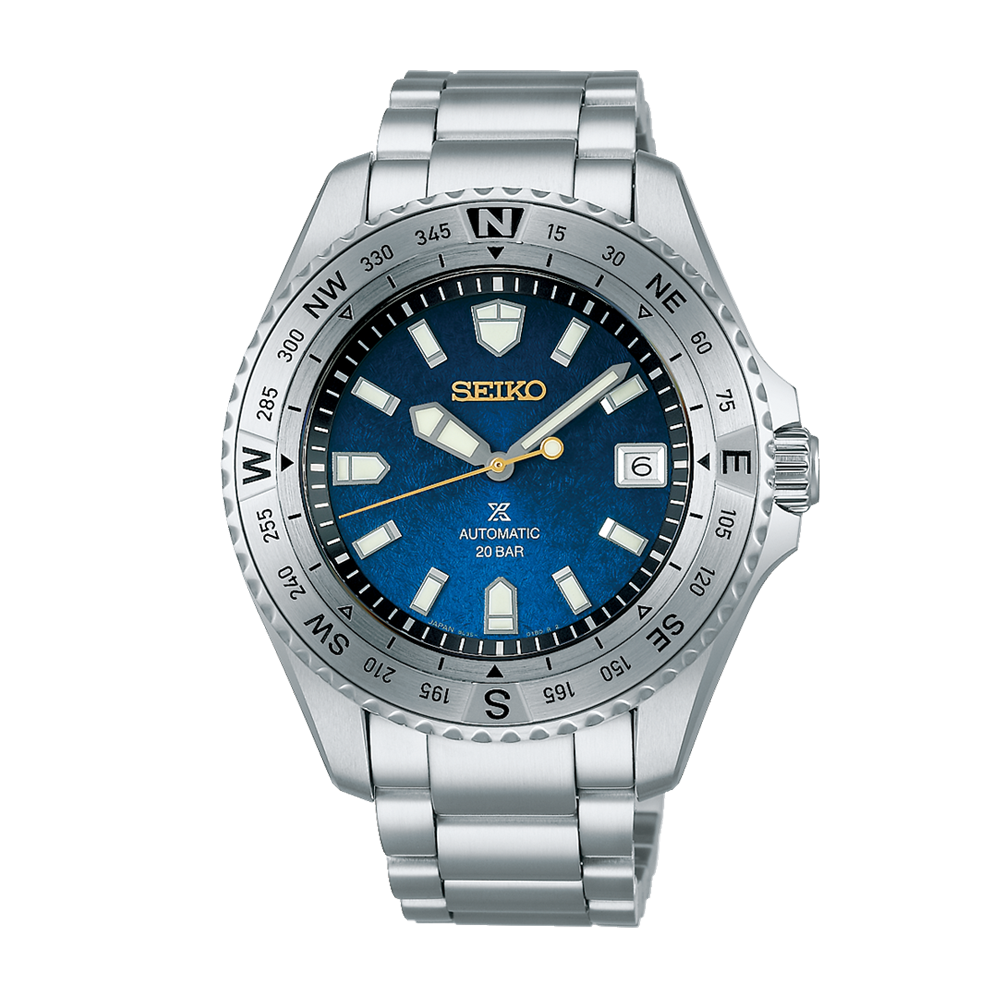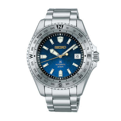 The Seiko Prospex Landmaster limited edition watch is powered by an automatic movement inside of a 42mm titanium case with a rotating compass bezel. The gradient blue dial includes a date window at 3 o'clock. It is covered by sapphire crystal. The titanium bracelet includes a deployant clasp. Water resistant to 200 meters. Limited edition of 1000 pieces.