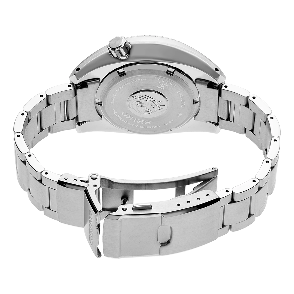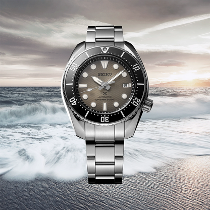 The Seiko Prospex SPB323 diver's watch features an automatic movement within a 45mm stainless steel case with a black ceramic rotating bezel. The gray dial includes a date display and is covered by sapphire crystal. The stainless steel bracelet includes a deployant clasp. Water resistant to 200 meters.