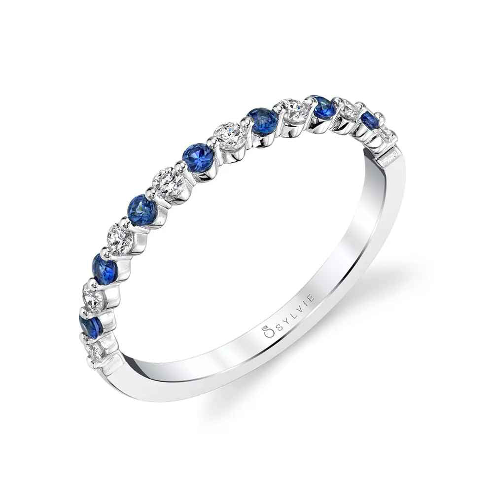 This Sylvie wedding band is crafted in 18K white gold. The ring features alternating round diamonds and blue sapphires. This stackable wedding band has a total diamond weight of 0.16 carats and a total blue sapphire weight of 0.21 carats.