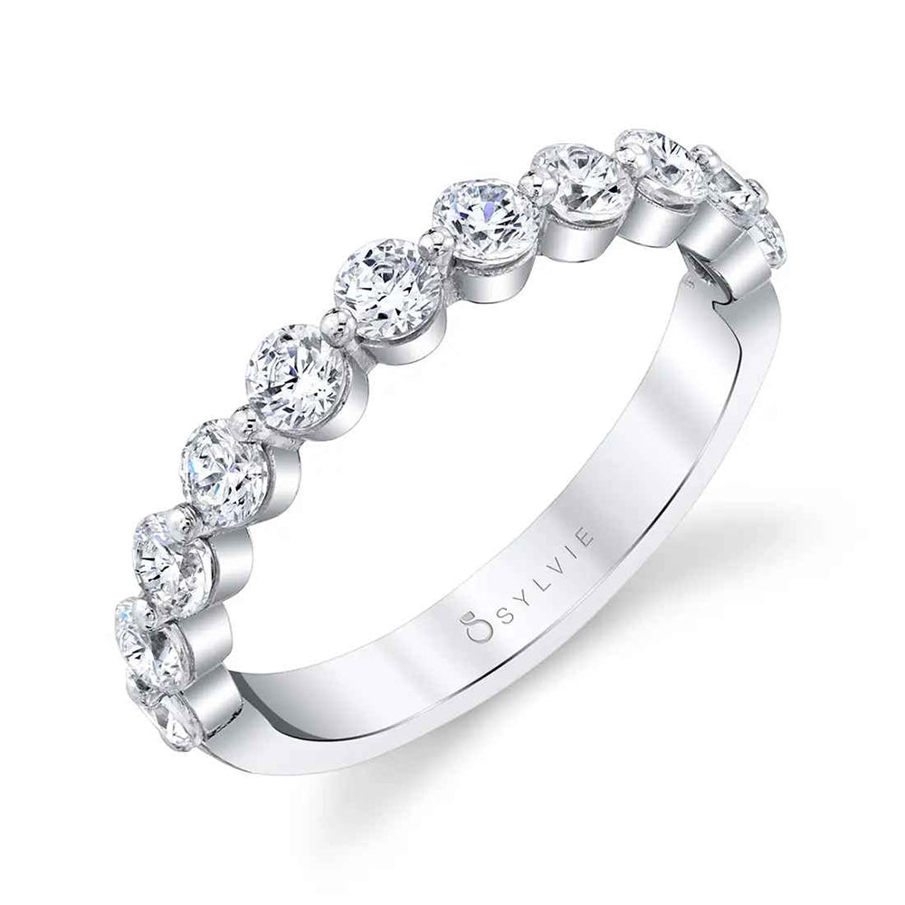 This Sylvie wedding band is crafted in 18K white gold. The stackable wedding band features 1.00 carat of round diamonds set halfway around the band.