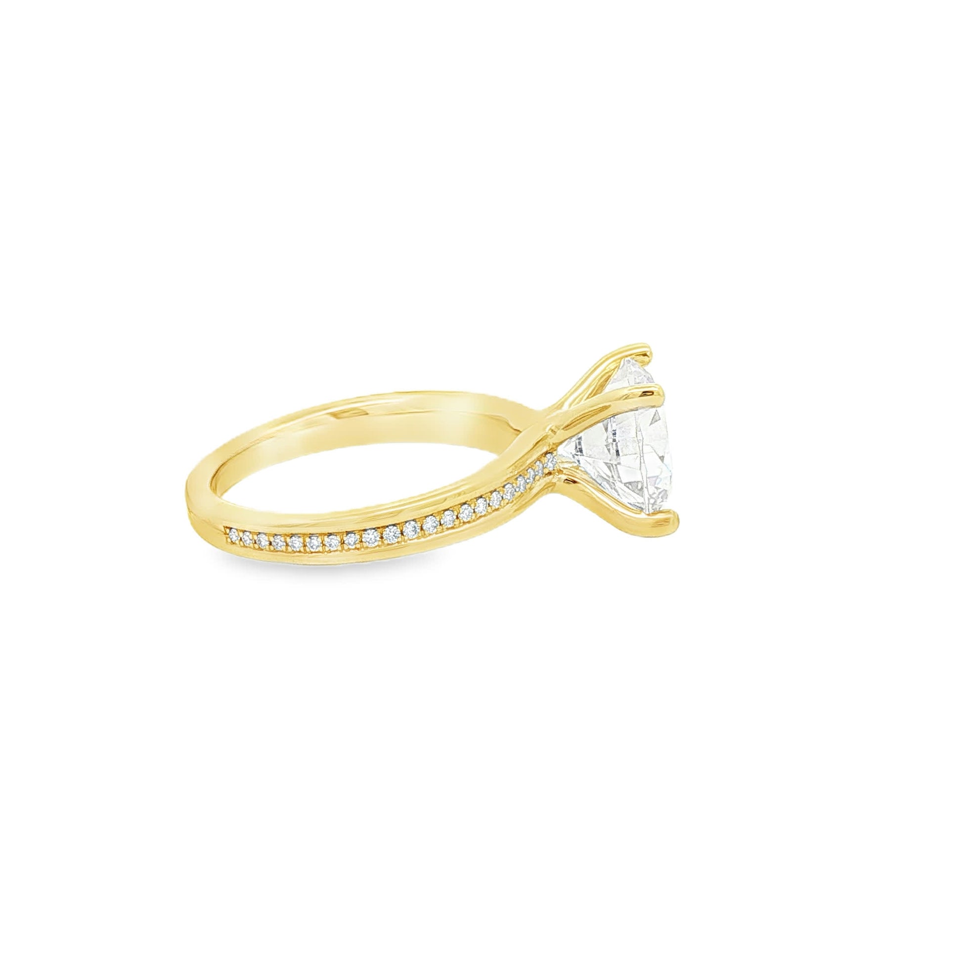 This Sylvie engagement ring is crafted in 18K Yellow Gold and is designed to hold a round center stone. The shank features a twisted braided design for unique vintage-inspired character. This engagement ring mounting does not include the center diamond. The mounting has a total diamond weight of 0.15 carats.