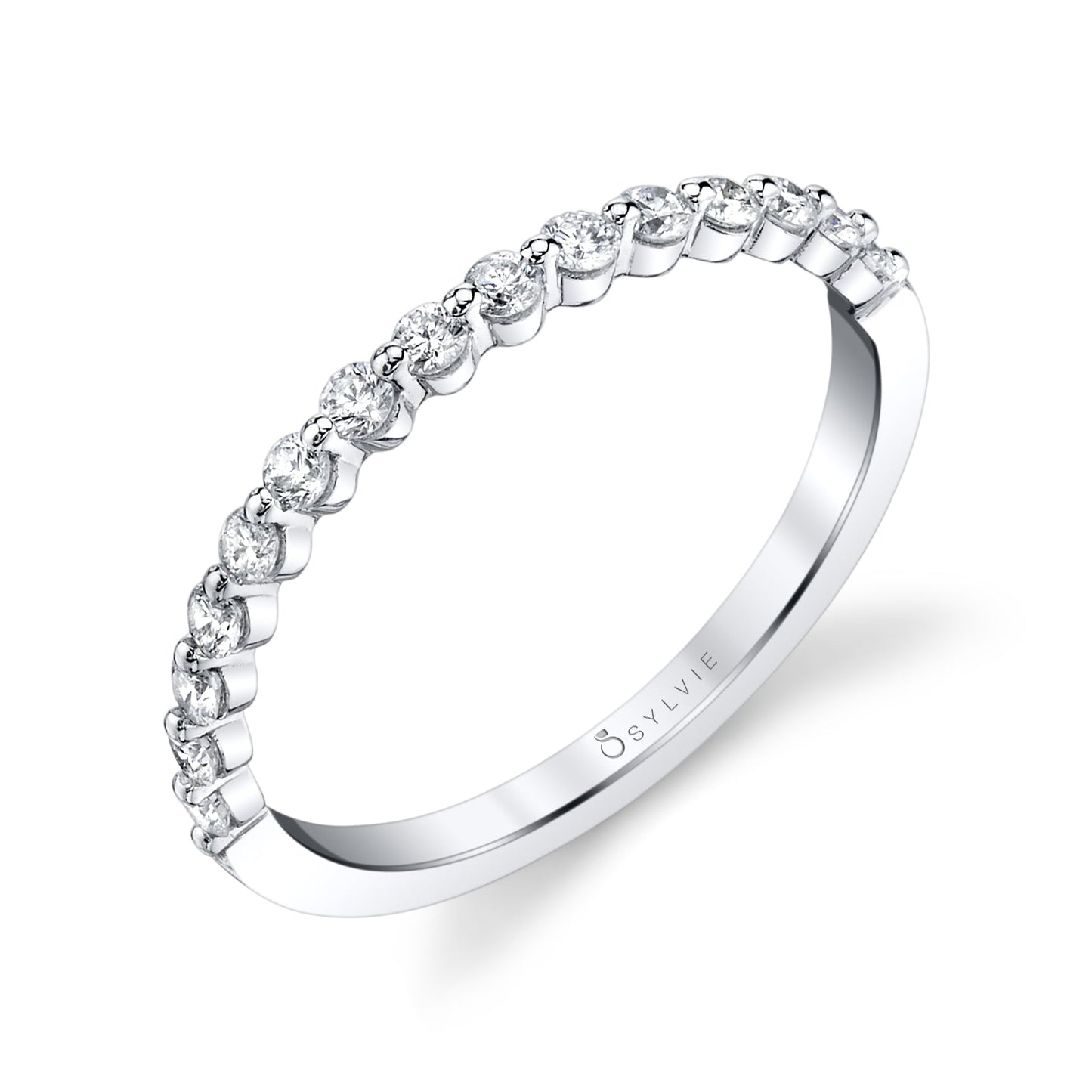This Sylvie Cerise wedding band is comprised of 18K white gold. The ring showcases 0.30 carats of round G-H color, SI clarity diamonds set in single prong settings halfway around the band.