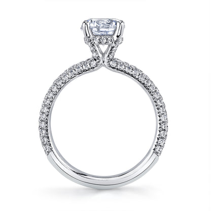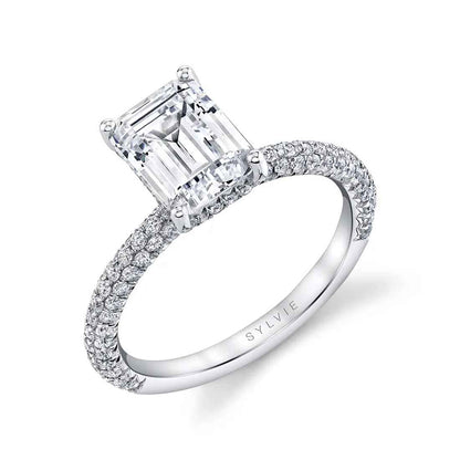 This Sylvie Jayla engagement ring mounting is designed to hold an emerald cut center stone. The 18K white gold ring features a hidden diamond halo and is adorned with pave set diamonds along the shank. This engagement ring mounting does not include the emerald cut diamond center stone. The total diamond weight of this ring is 0.63 carats.