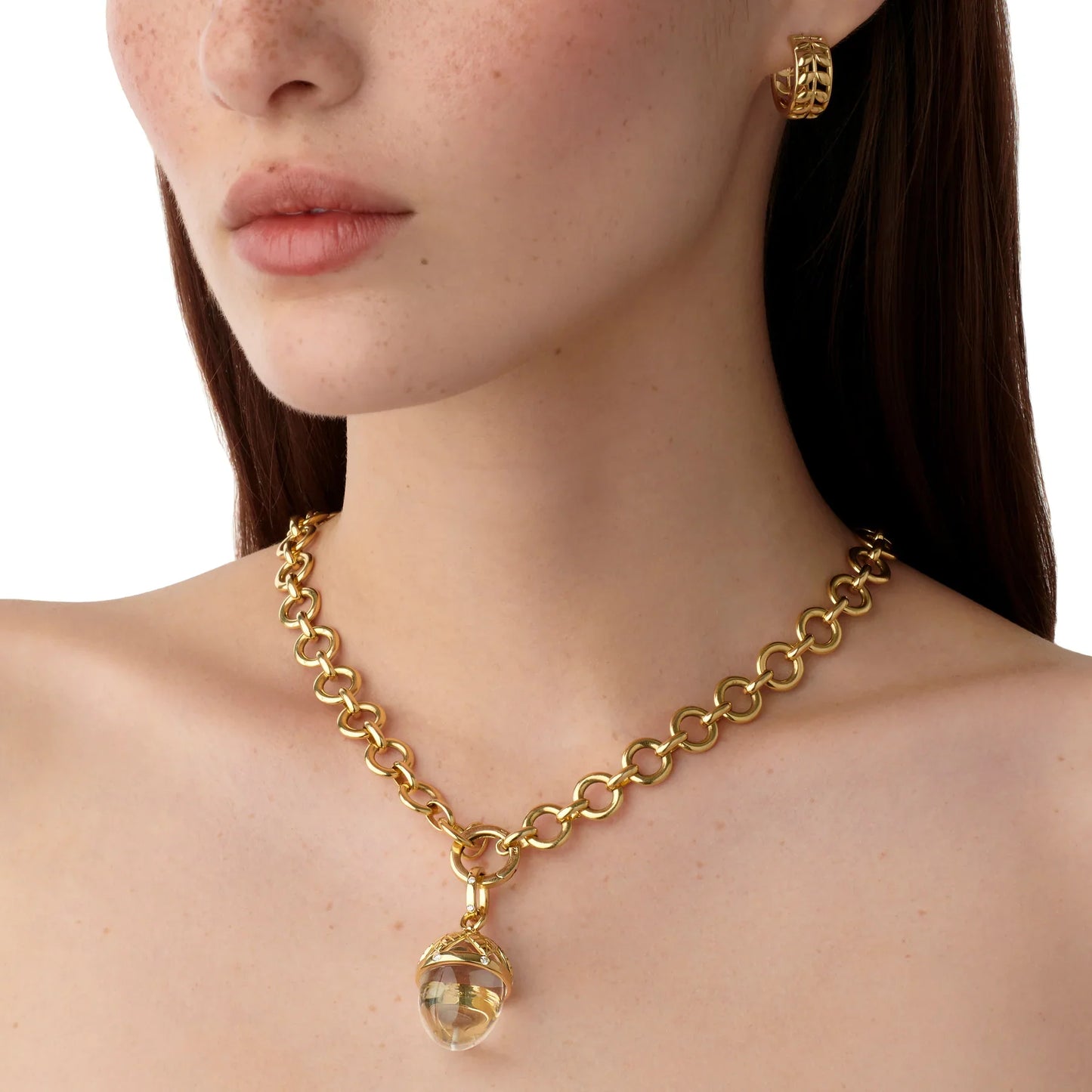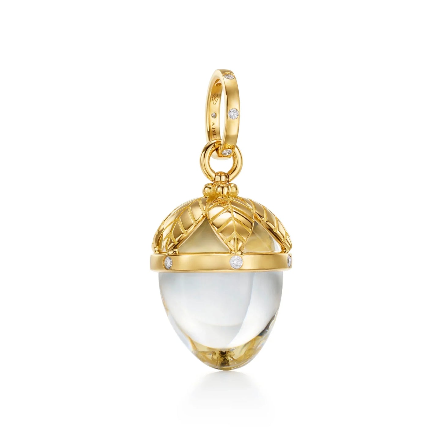This Temple St Clair Arcadia rock crystal pendant is comprised of 18K yellow gold. The pendant features egg shaped rock crystal suspended from a crown of 18K yellow gold leaves. It is adorned with 0.23 carats of diamonds and measures approximately 1.5 inches long.
