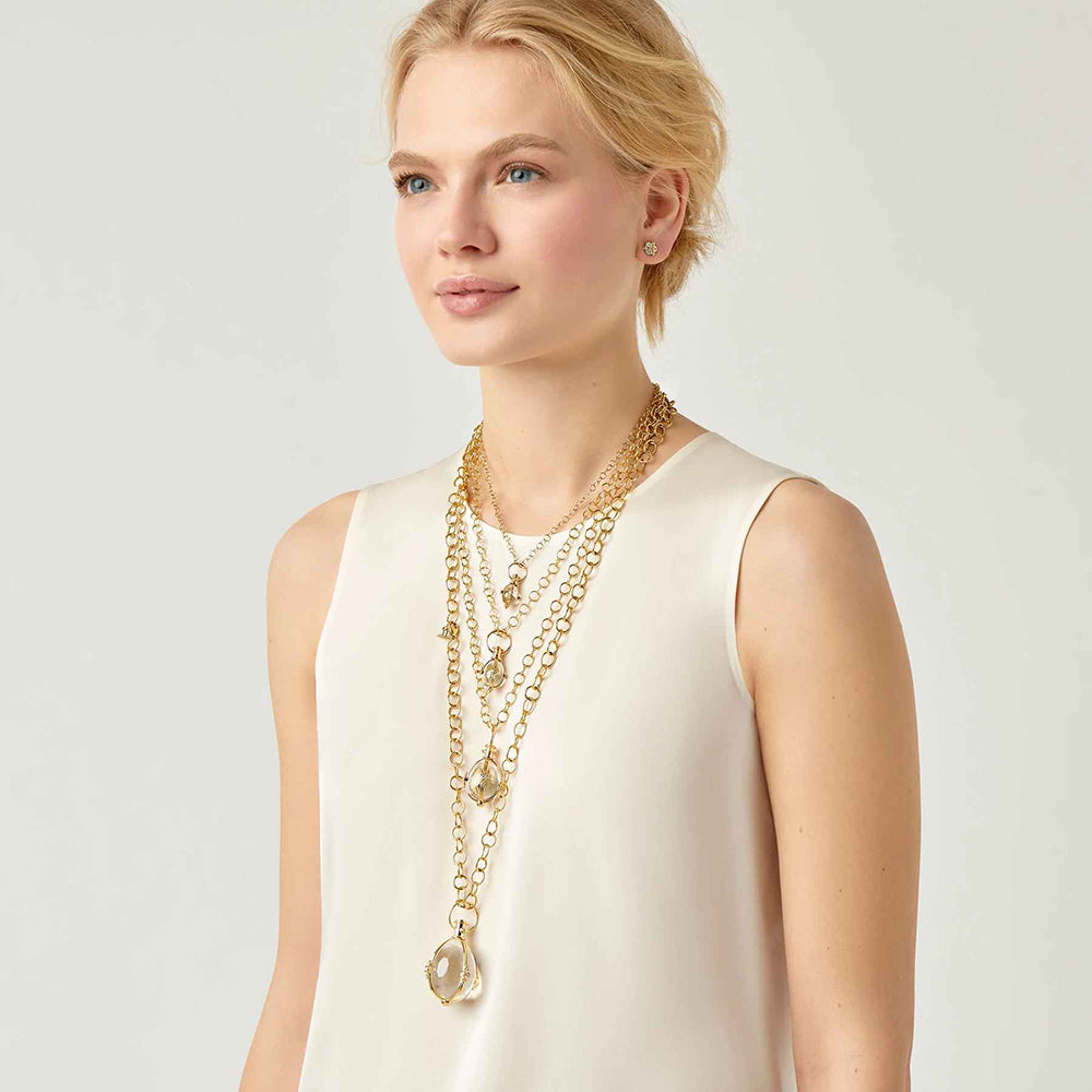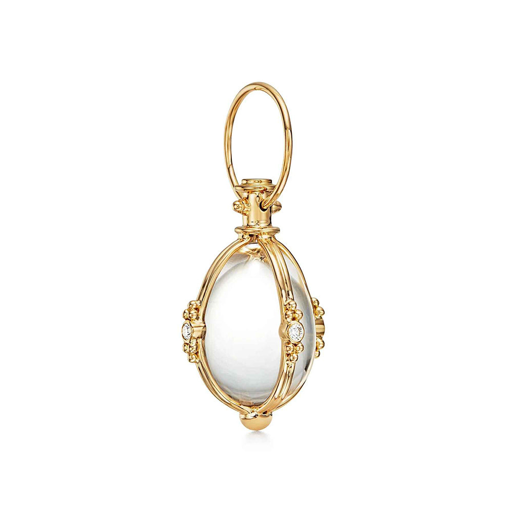 This Temple St Clair Classic Amulet pendant is made of 18K yellow gold. It features a natural rock crystal accented by 0.24 carats of round diamonds. The medium pendant measures approximately 2 inches long by 0.9 inches wide.