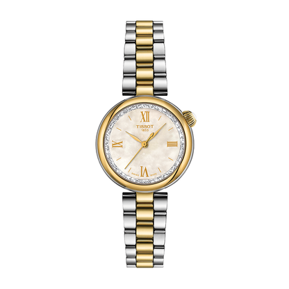 The Tissot Desir watch has a quartz movement contained within a 28mm stainless steel and yellow gold PVD case. The mother of pearl dial with Roman numerals is protected by sapphire crystal. The stainless steel and yellow gold PVD bracelet has a deployant clasp. Water resistant to 50 meters.