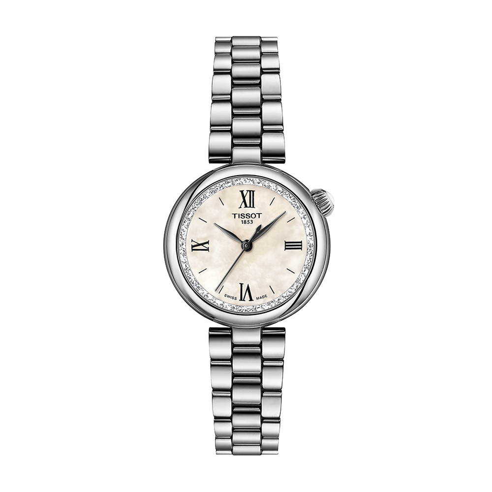 The Tissot Desir watch runs on a quartz movement housed within a 28mm stainless steel case. The white mother of pearl dial is covered with sapphire crystal. The stainless steel bracelet leads to a folding clasp. Water resistant to 50 meters.