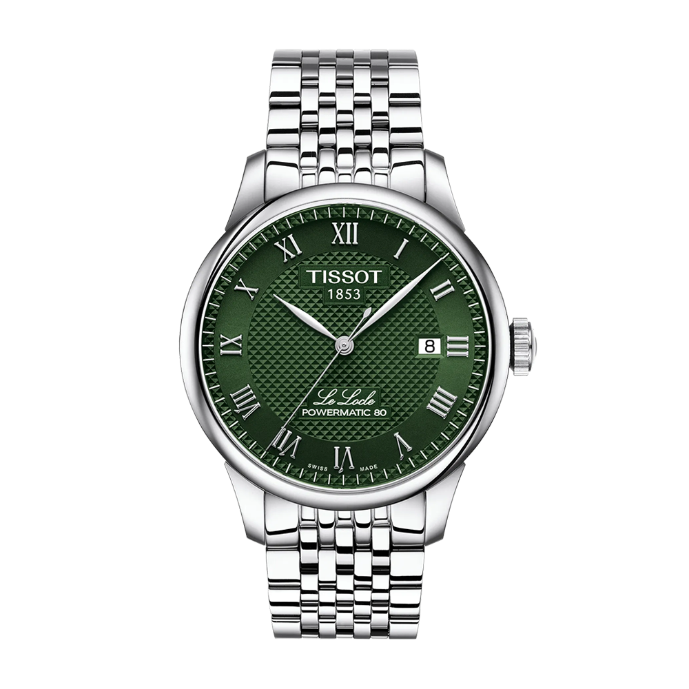 The Tissot Le Locle Powermatic 80 has an automatic movement housed within a 39.30mm stainless steel case. The green dial with Roman numerals includes a date window. It is protected by sapphire crystal. The stainless steel bracelet is secured by a deployant clasp. Water resistant to 30 meters.