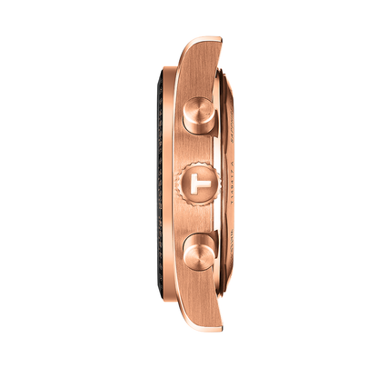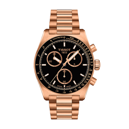 The Tissot PR516 watch has a quartz movement housed within a 40mm rose gold PVD coated steel case with a black tachymeter scale bezel. The black dial showcases a chronograph function and is covered with sapphire crystal. The rose gold PVD coated steel bracelet leads to a folding clasp. Water resistant to 100 meters.
