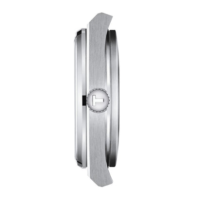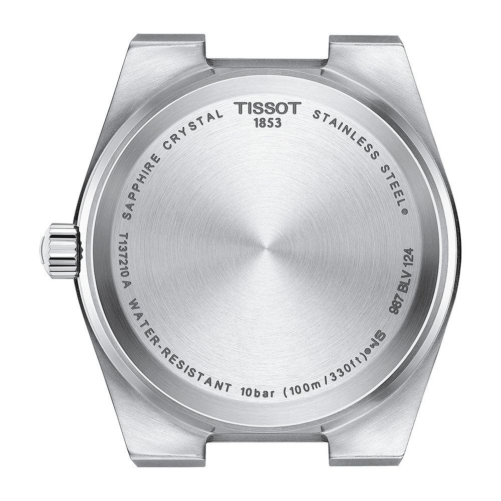 The Tissot PRX watch is powered by a quartz movement within a 35mm stainless steel case. The blue dial showcases a date window at 3 o'clock. It is covered by sapphire crystal. The stainless steel bracelet leads to a deployant clasp. Water resistant to 100 meters.