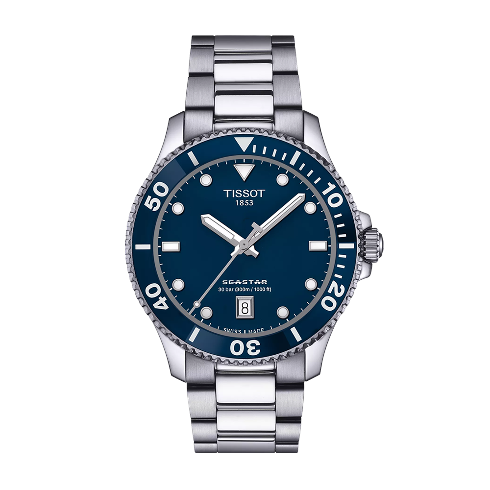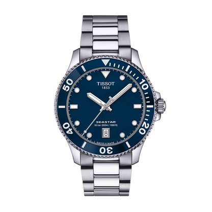 The Tissot Seastar 1000 40mm watch is powered by a quartz movement inside of a 40mm stainless steel case with a blue rotating bezel. The blue dial reveals a date window at 6 o'clock. It is covered by sapphire crystal. The stainless steel bracelet leads to a deployant clasp. Water resistant to 300 meters.