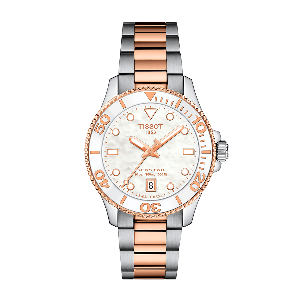 The Tissot Seastar 1000 watch is powered by a quartz movement inside of a 36mm stainless steel and rose gold PVD case with a white rotating bezel. The white mother of pearl dial reveals a date window at 6 o'clock. It is protected by sapphire crystal. The stainless steel and rose gold PVD bracelet leads to a deployant clasp. Water resistant to 300 meters.