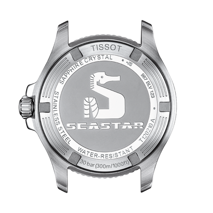 The Tissot Seastar 1000 watch is powered by a quartz movement inside of a 36mm stainless steel and rose gold PVD case with a white rotating bezel. The white mother of pearl dial reveals a date window at 6 o'clock. It is protected by sapphire crystal. The stainless steel and...