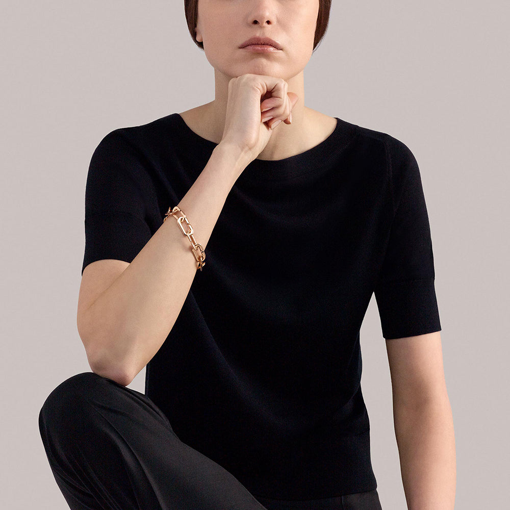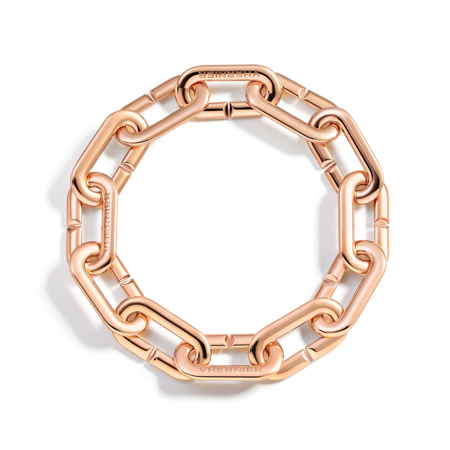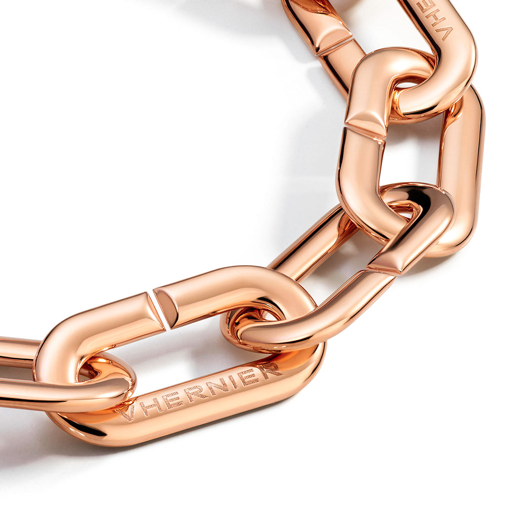 This Vhernier Mon Jeu bracelet is crafted in 18K rose gold. This modern chain bracelet has 12 rose gold links. It is designed to comfortably fit wrists that are between 15.5 centimeters to 17 centimeters.