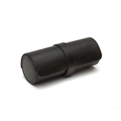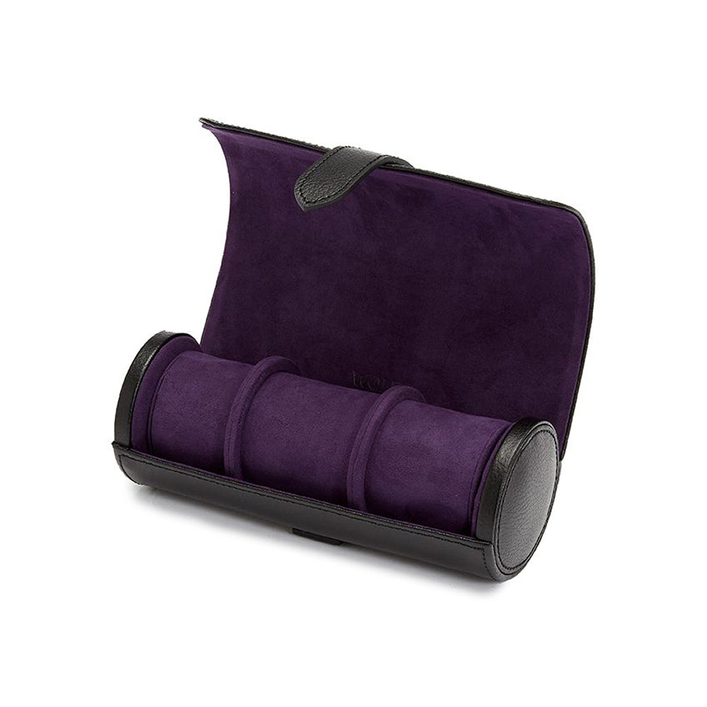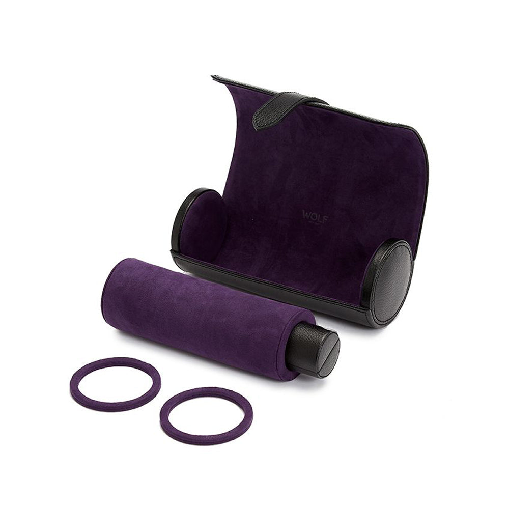 The Wolf Blake Watch Roll is made of black pebble leather with purple Ultrasuede interior. It is designed to hold three watches and features a hidden compartment to store small valuables.