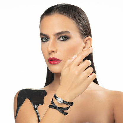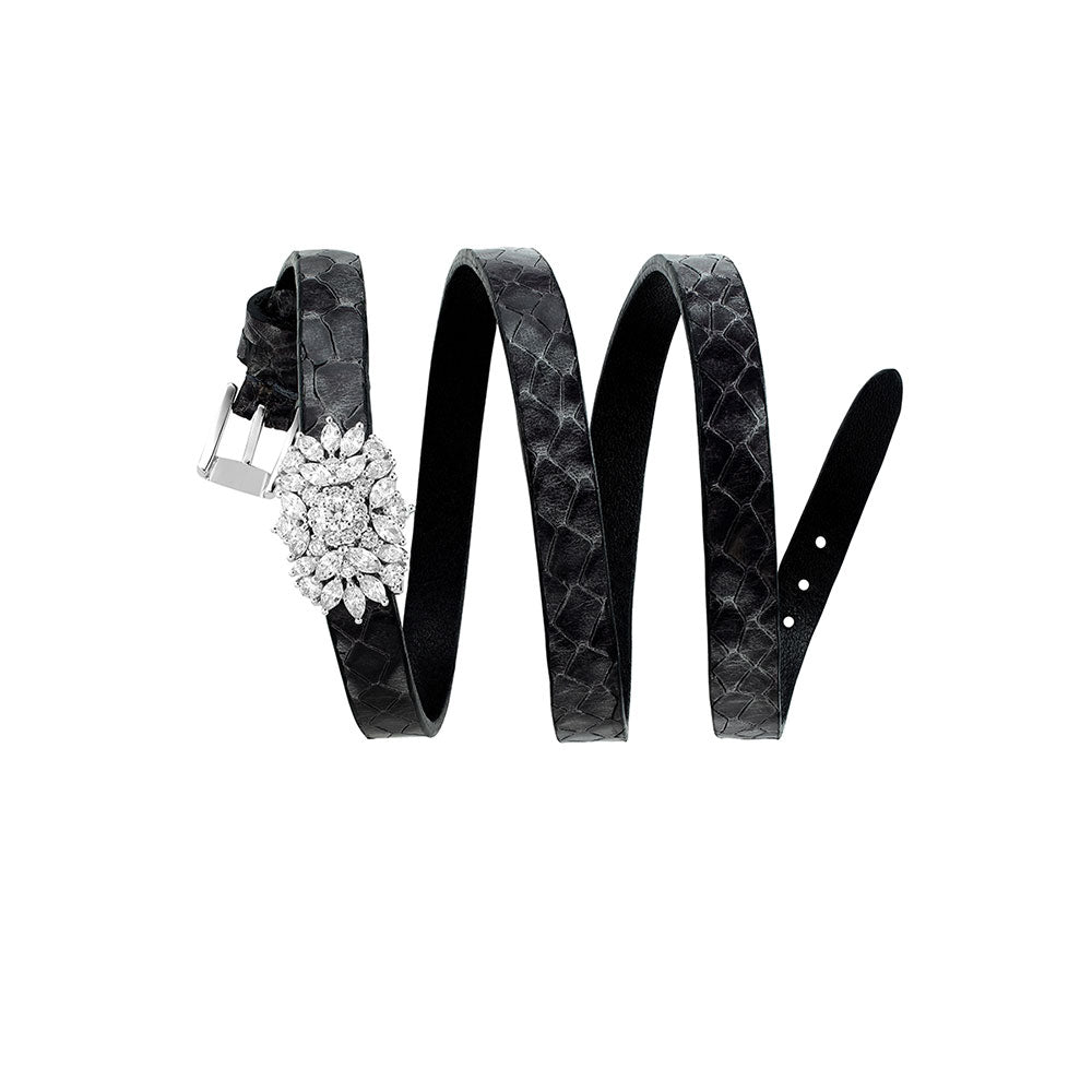This Yeprem Leathership black leather wrap bracelet features an 18K white gold pin buckle. It is decorated with approximately 2.57 carats of round and marquise diamonds.
