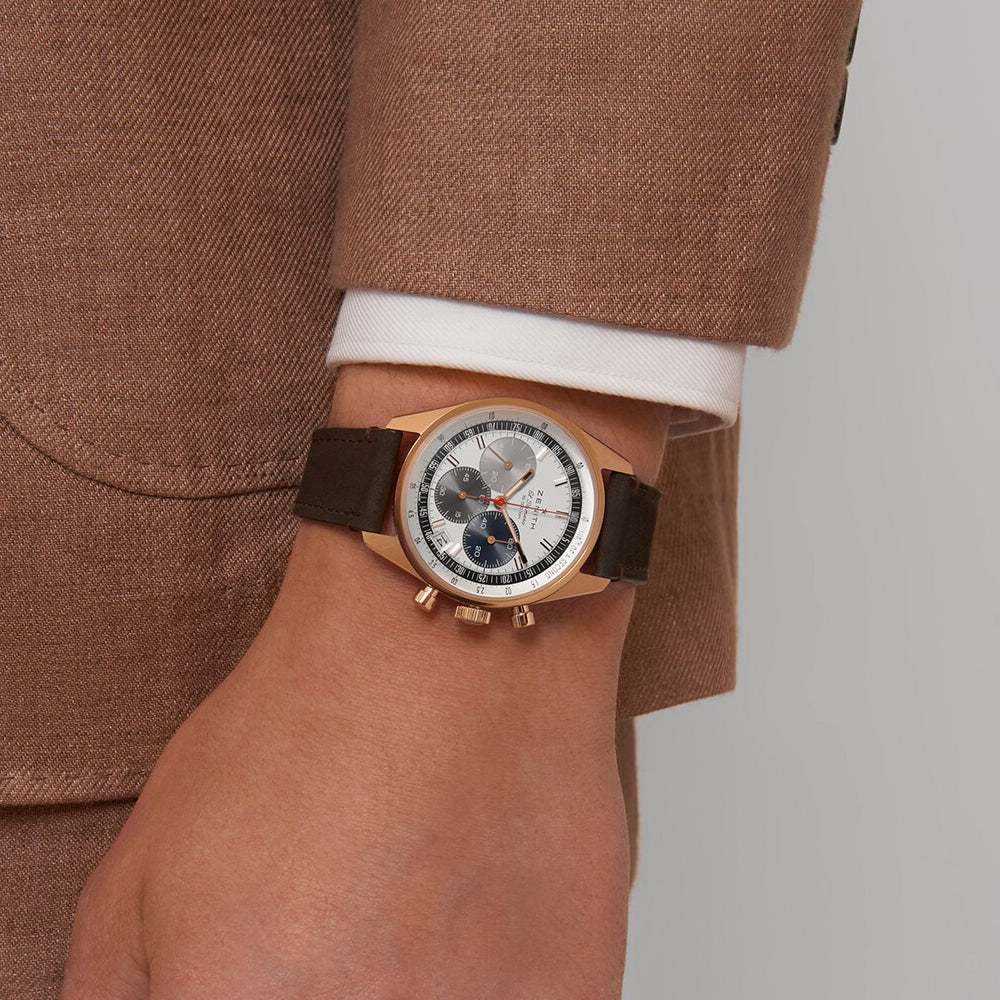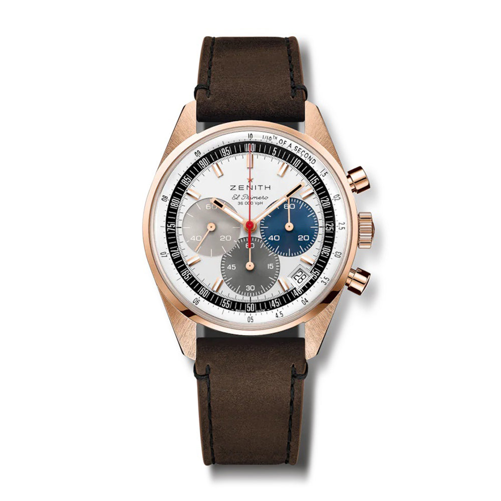 This Zenith Chronomaster Original is powered by an automatic movement within a 38mm rose gold case. The white lacquered dial has tri-color counters and is protected by sapphire crystal. Features include a chronograph function and date display. The brown leather strap includes a rose gold triple folding clasp. Water resistant to 50 meters.