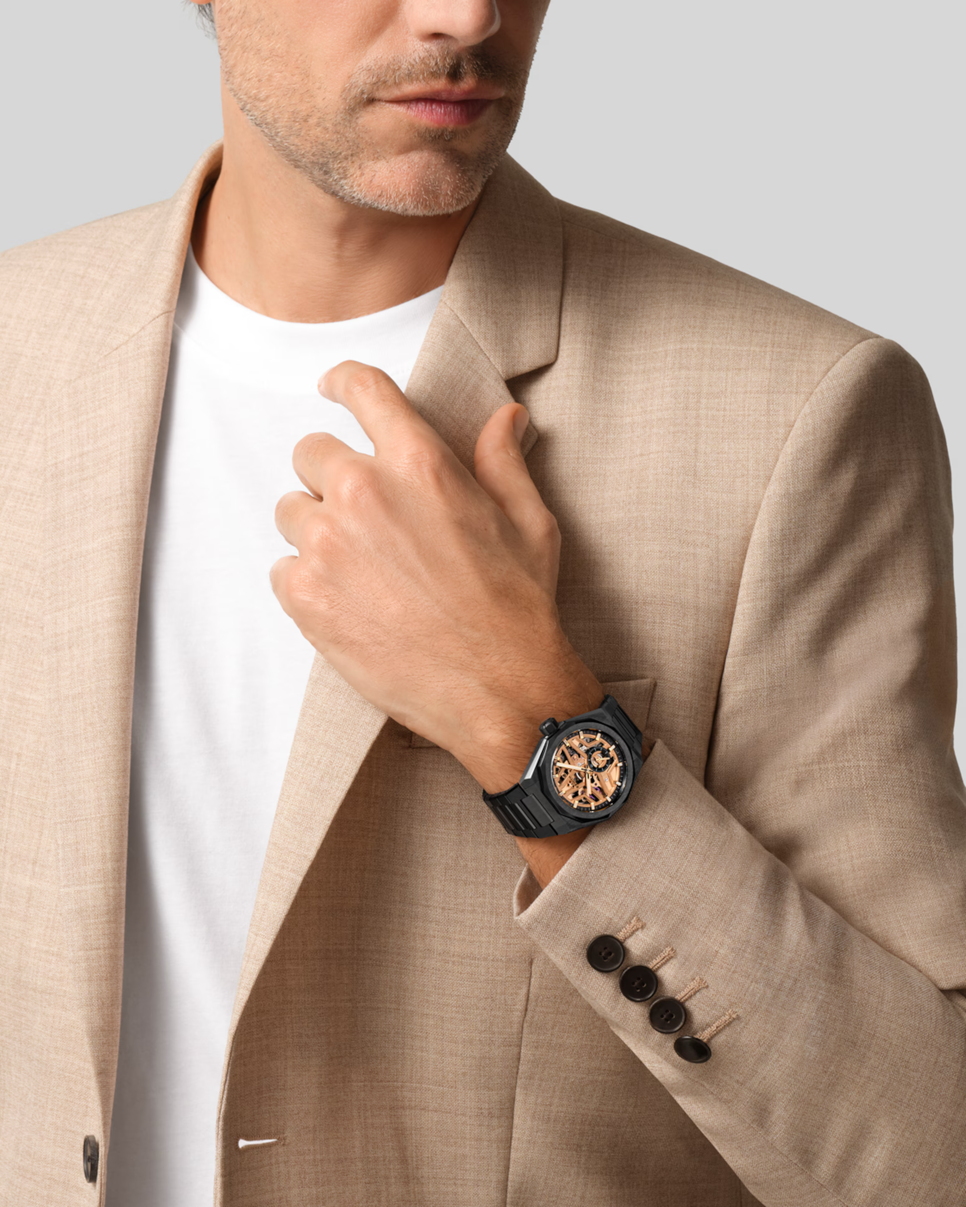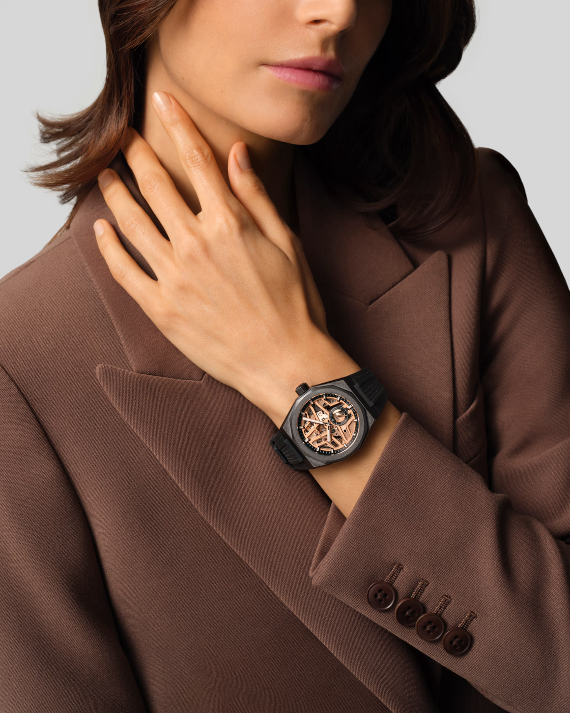 The Zenith DEFY Skyline Skeleton features a 41mm black ceramic octagonal case with a faceted bezel. The gold-toned open-worked dial reveals the El Primero 3620 SK skeleton movement with 1/10th of a second display. Interchangeable black ceramic bracelet and black patterned rubber strap. 100m water resistance, 60-hour power reserve.