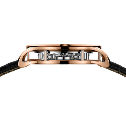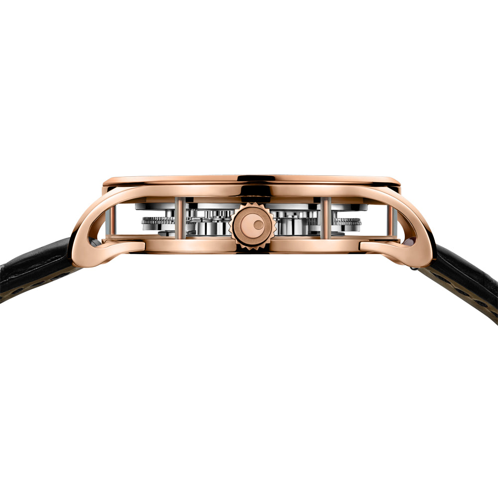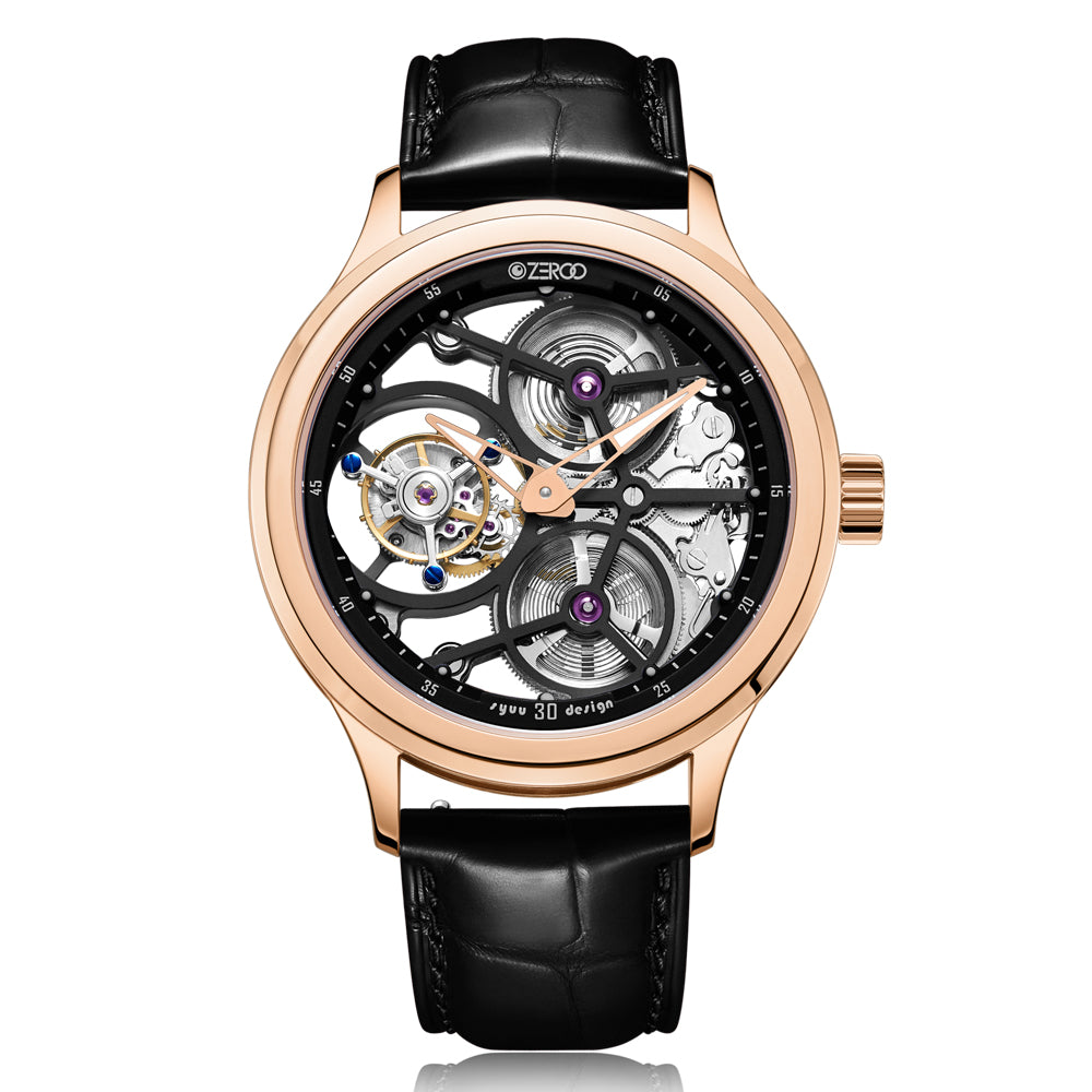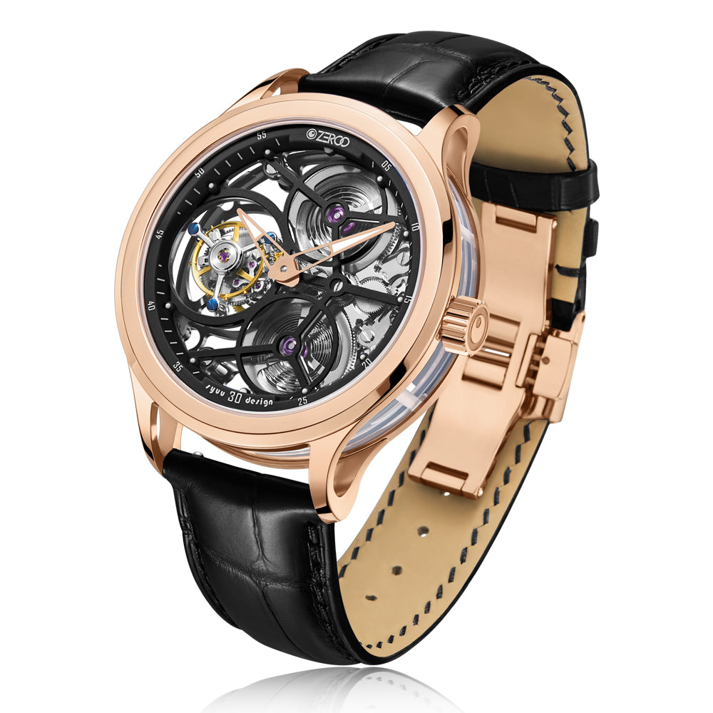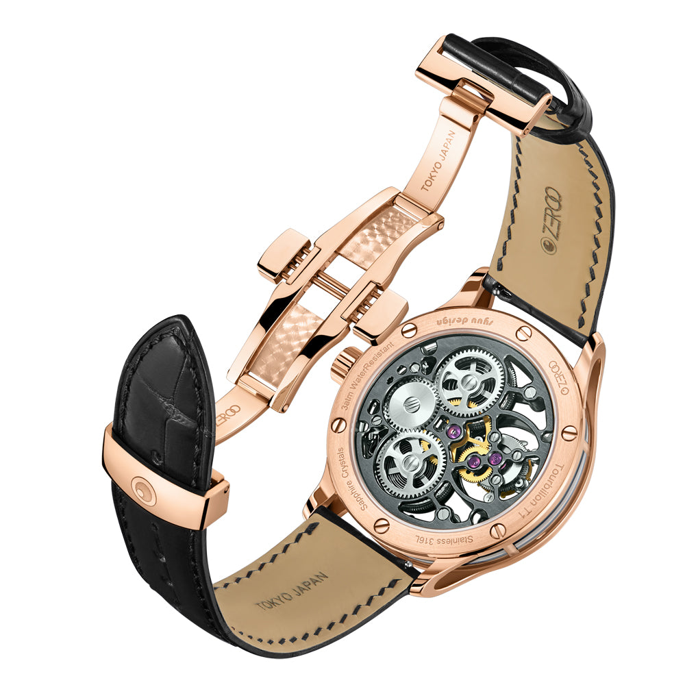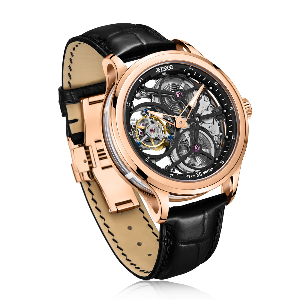 The Zeroo Time T1 The Archer Full Skeleton Tourbillon watch contains a manual movement. The 43mm rose gold-colored stainless steel case has crystal glass sides. The skeleton dial showcases a tourbillon and is protected by sapphire crystal. The black leather strap includes a deployant buckle. Water resistant to 30 meters.