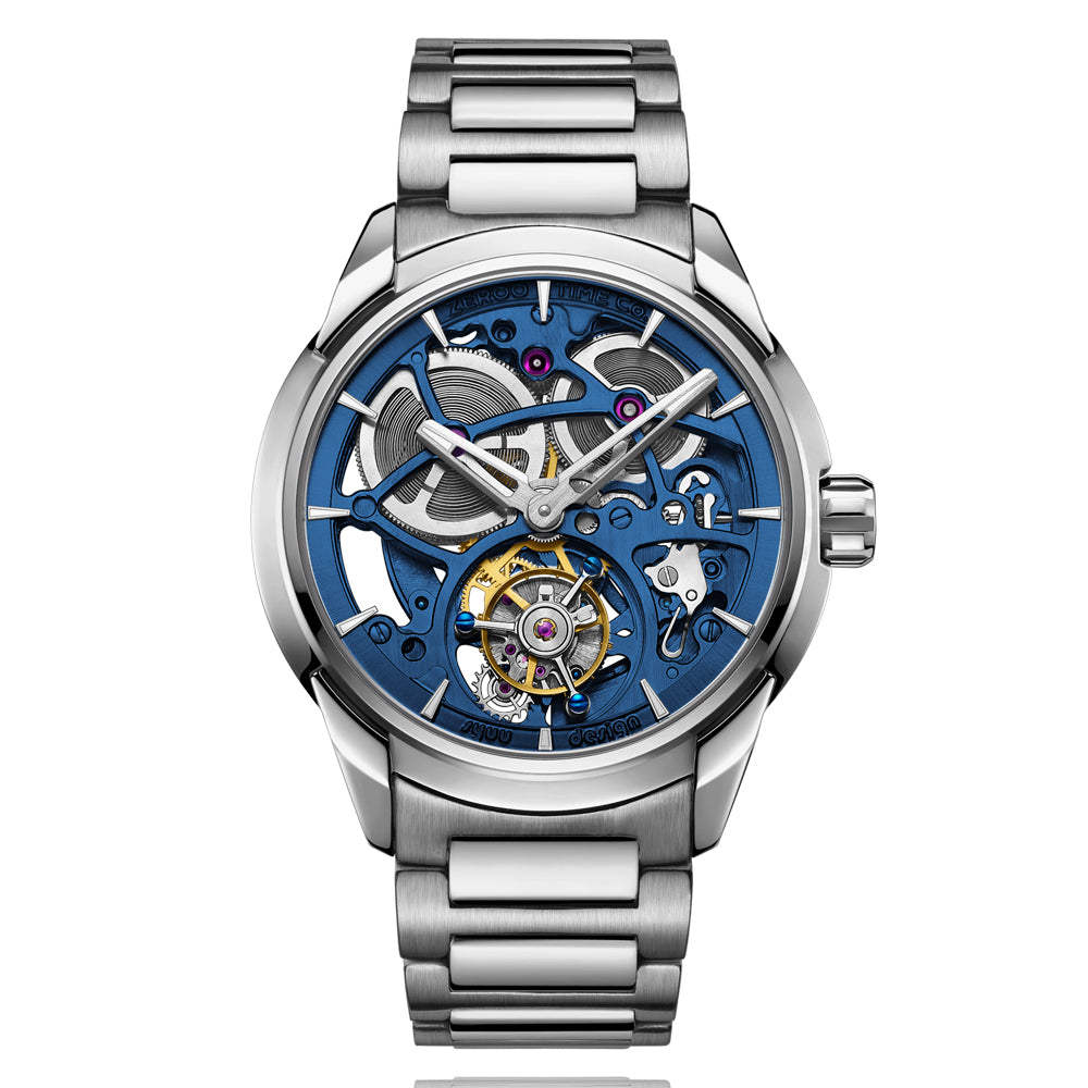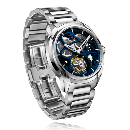 This Zeroo Time T3 The Leo Automatic Skeleton Tourbillon includes an automatic movement in a 43mm stainless steel case. The blue skeleton dial reveals a tourbillon and is covered by sapphire crystal. The stainless steel bracelet leads to a deployant buckle. Water resistant to 50 meters.