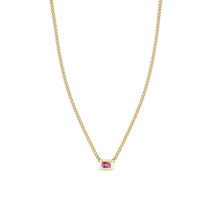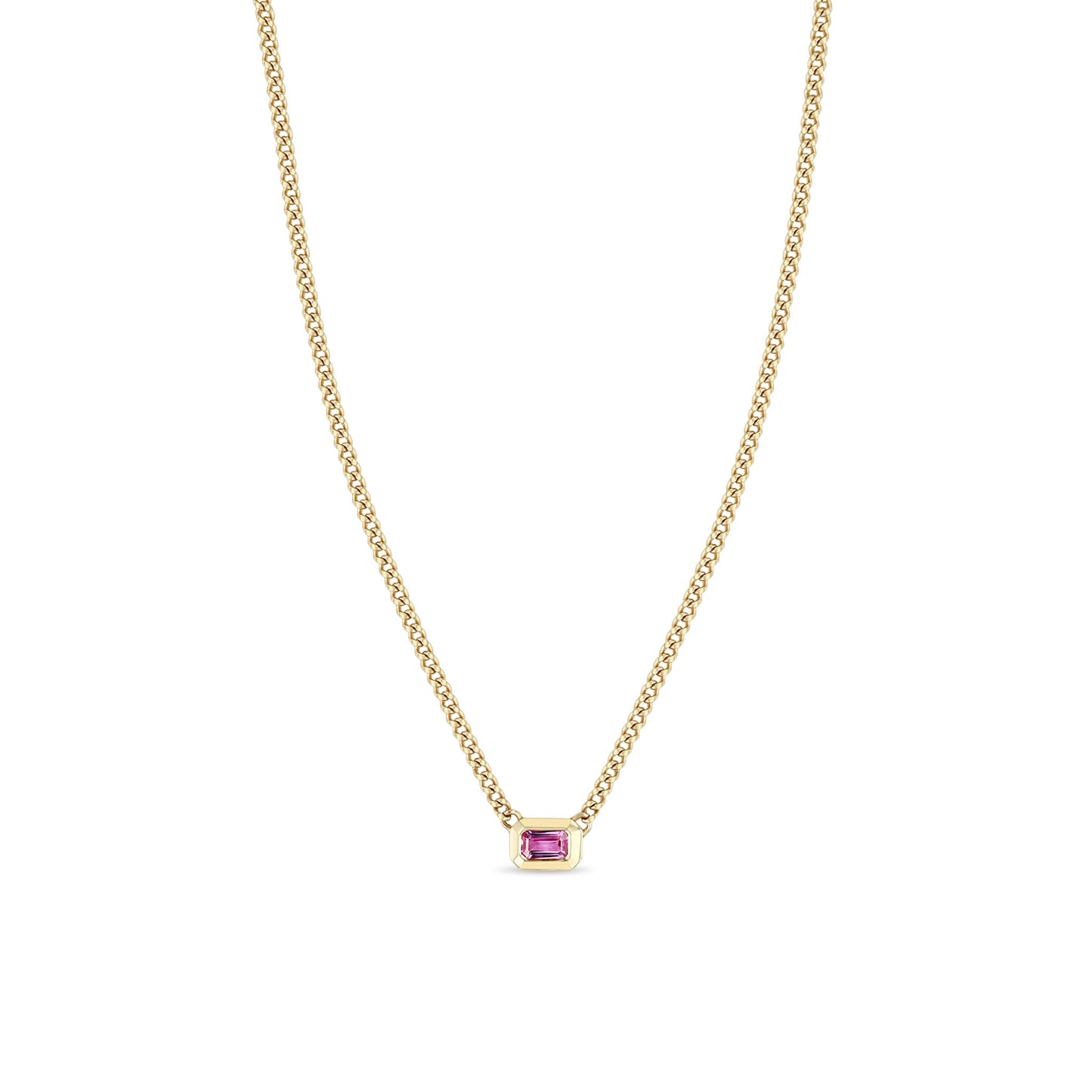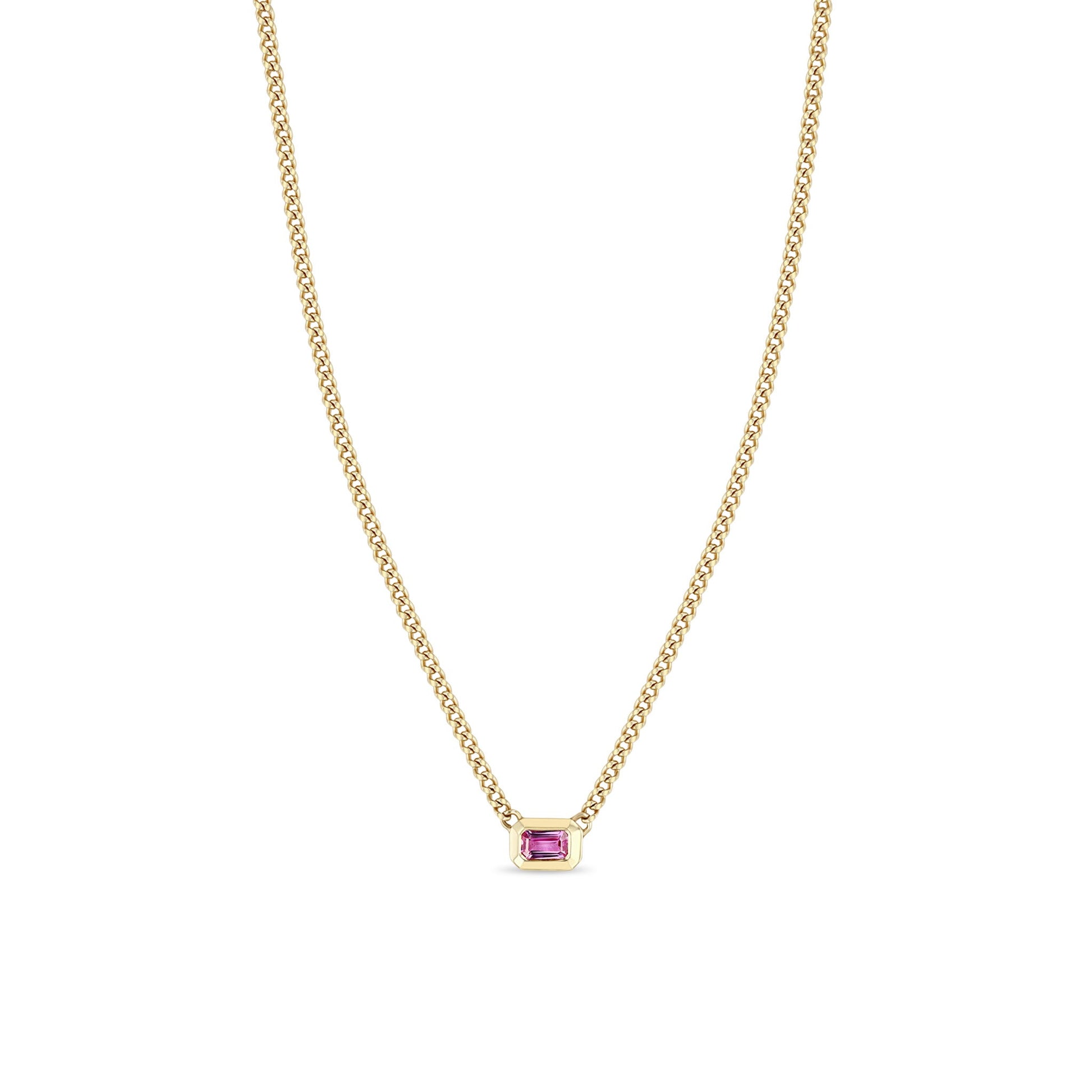 This Zoe Chicco XS curb chain necklace is fashioned in 14K yellow gold. The necklace is set with a 0.31 carat emerald cut bezel set pink sapphire gemstone along the extra small hollow curb chain. It is adjustable from 14 to 16 inches long.