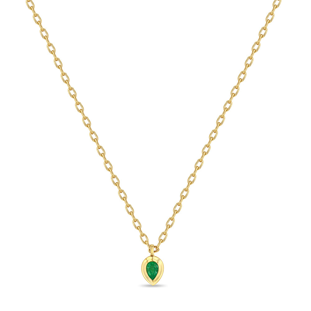 This Zoe Chicco emerald pendant necklace is made of 14K yellow gold. The necklace features a pear-shaped emerald pendant on a small square oval link chain adjustable from 16 to 18 inches.