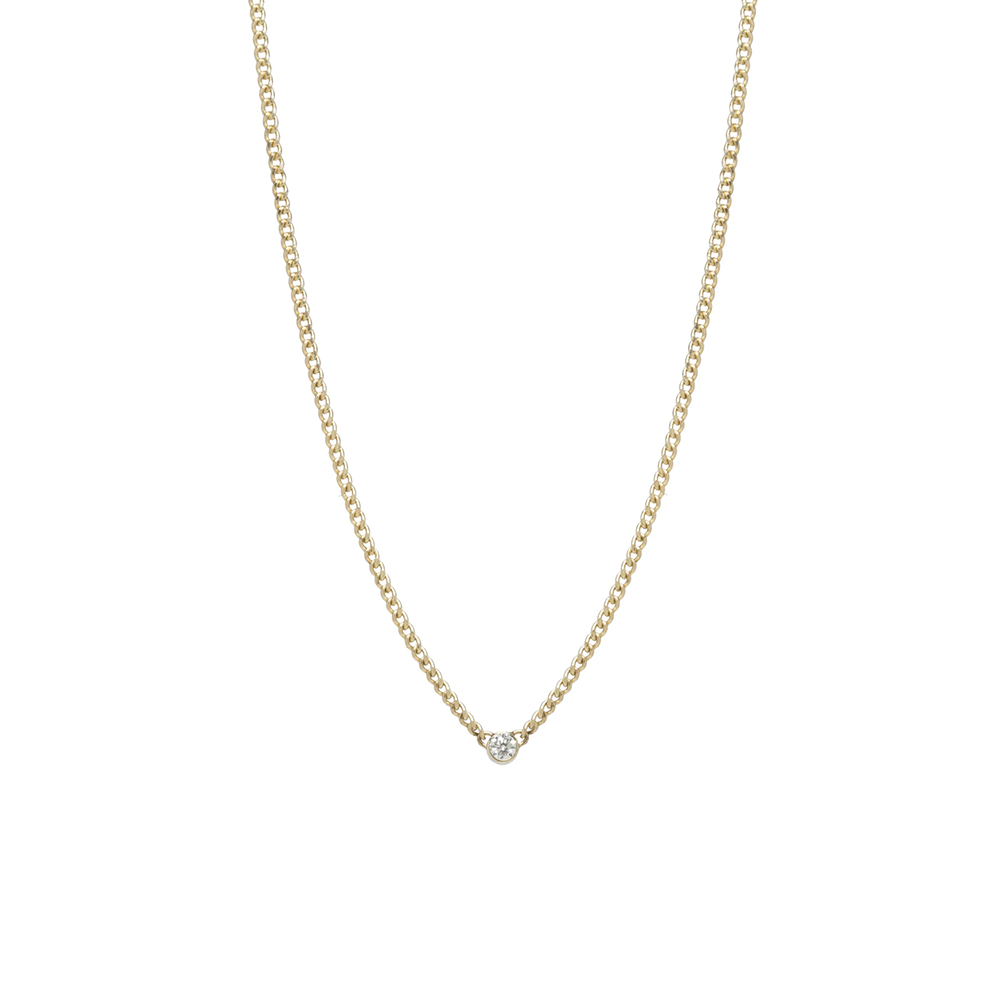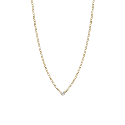 This Zoe Chicco extra small curb chain necklace is made of 14K yellow gold. The necklace is set with one 0.10 carat bezel set diamond. The chain is adjustable up to 16 inches.
