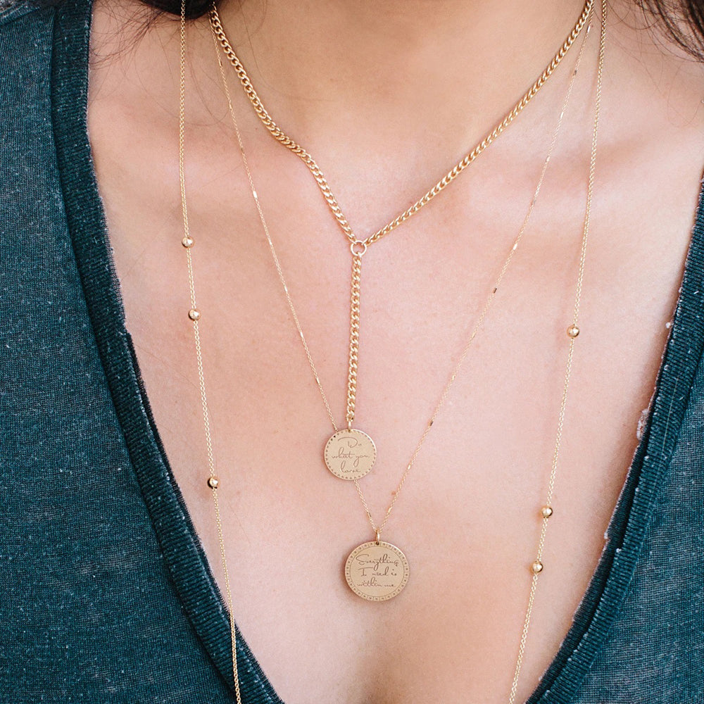 This Zoe Chicco Medium Mantra Necklace is crafted in 14K yellow gold. The 20mm disc pendant is engraved with the mantra “Everything I Need is Within Me.” The cable chain is adjustable up to 24 inches long.