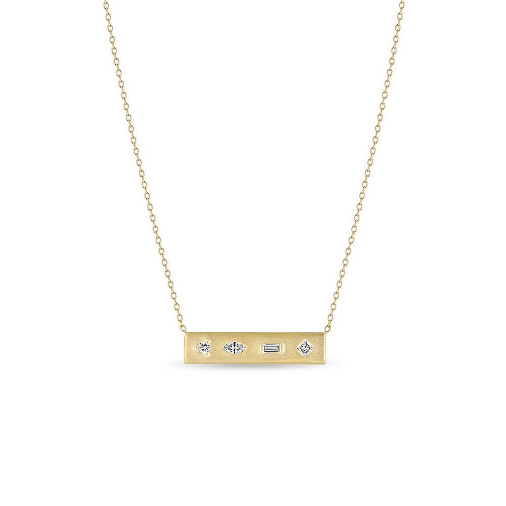 This Zoe Chicco horizontal bar necklace is made of 14K yellow gold. The bar pendant is set with 0.21 carats of mixed shape diamonds.