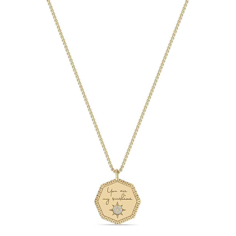 This Zoe Chicco mantra pendant necklace is crafted in 14K yellow gold. The octagon pendant features the mantra "You are my Sunshine" and a diamond sun design. The total diamond weight of this necklace is 0.04 carats. The extra small box chain is adjustable from 16 to 18 inches.